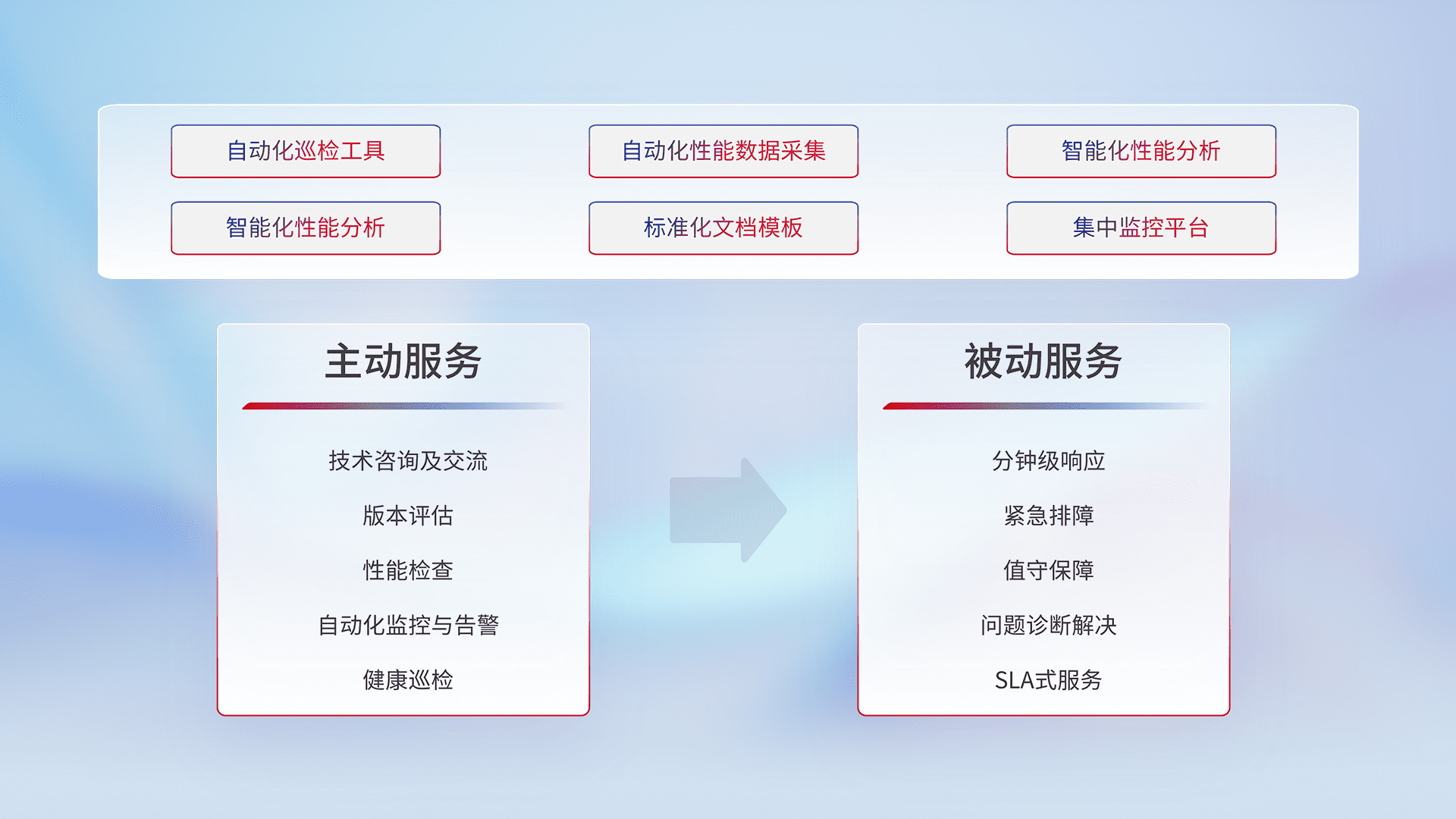 智能化工具和标准化文档,,,保障服务质量,,提供主动服务(包含技术咨询、、、、版本评估、、、性能检查、、、、自动化监控与告警、、、、健康巡检)和被动服务包含(分钟级响应、、、、紧急排障、、值守保障、、、、问题诊断解决、、、SLA服务)。。。。