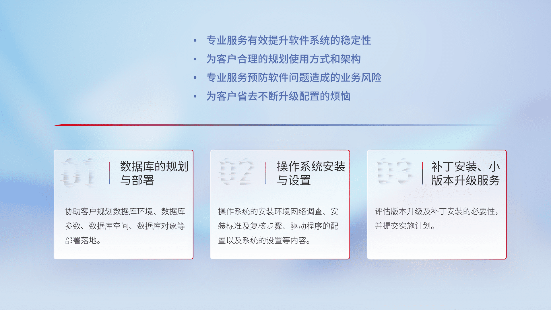 为客户提供软件规模升级、、快速部署、、、按需配置的专业服务,,,,从数据库的规划与部署到操作系统的安装与设置,,,再到补丁安装和小版本升级提供支持。。